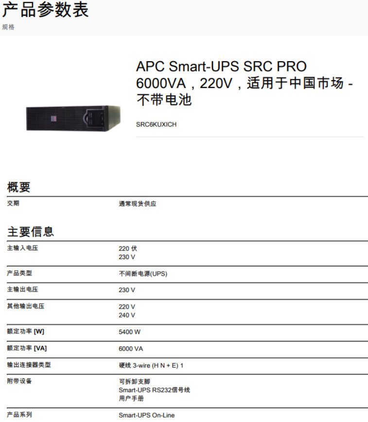 APC公司的Smart-UPS RC,6KVA,230V,适用于中国 适用于服务器、语音和数据网络、医疗实验室和轻工业应用的紧凑型高密度 UPS。在线双转换技术提供一致、清洁的电源,有助于在关键时刻保护您的 IT 设备。